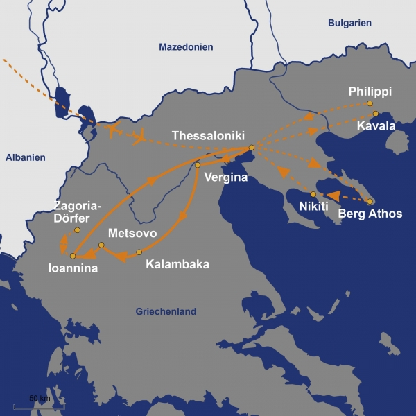 Diese Reise durch den Norden Griechenlands ist gespickt mit weltbekannten aber auch weniger bekannten Highlights. Sie entdecken Thessaloniki, Kavala und die Meteoraklöster. Aber kennen Sie Metsovo und die bedeutende Festungsstadt Ioannina? Lernen Sie nicht nur die Geschichte, sondern auch die kulinarischen Highlights des Nordens bei einigen zusätzlichen Verkostungen kennen. Ein ausgewogenes Programm zwischen Kultur und Natur erwartet Sie bei dieser Rundreise.